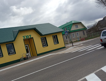 Каля магазіна "Уют" стаіць веласіпед, а побач у кадр трапляе аўтамабіль. Дарогі ў будні позні ранак і апоўдні паўпустыя ў цэнтры гарадка, але веласіпед і аўтамабіль застаюцца галоўнымі транспартнымі сродкамі тут.